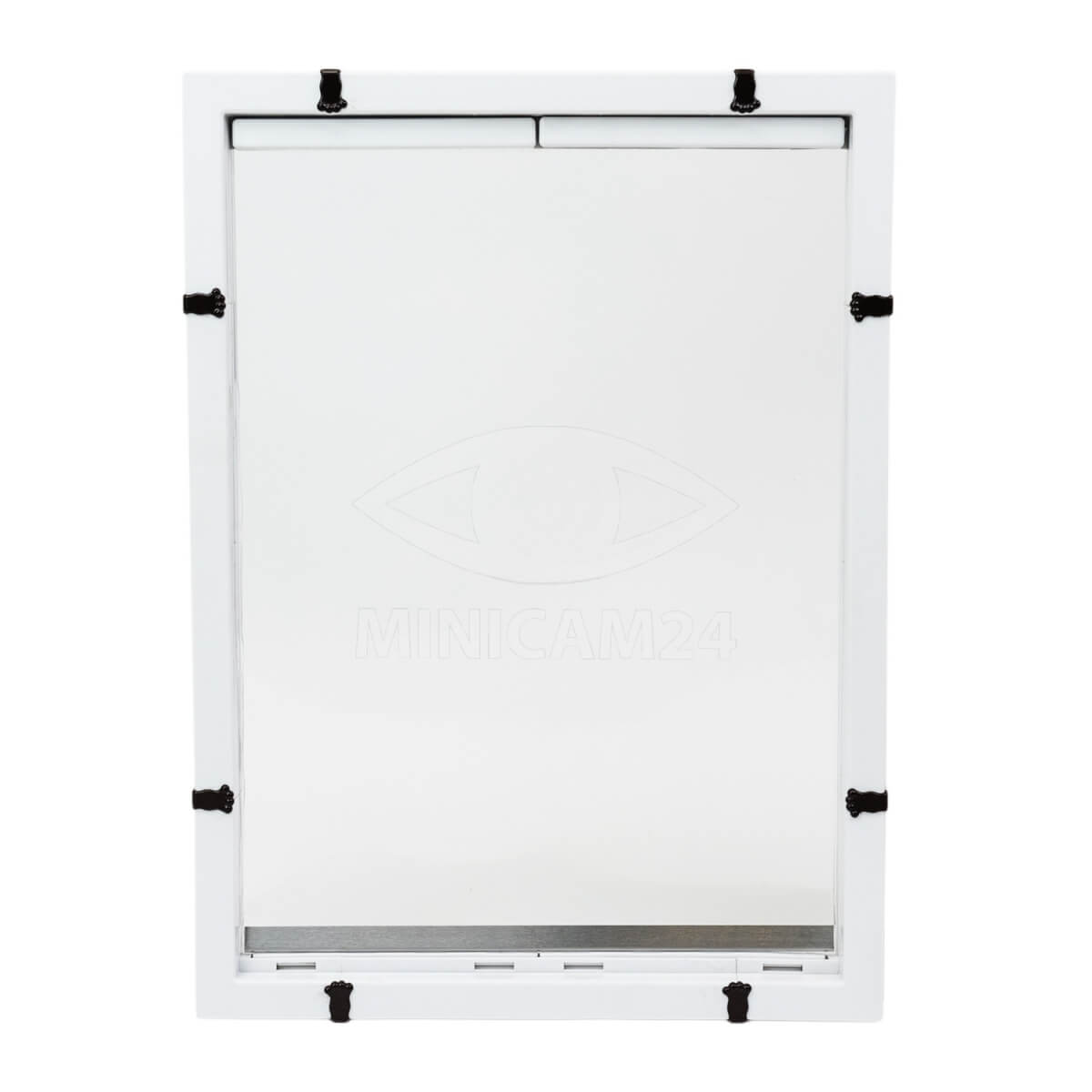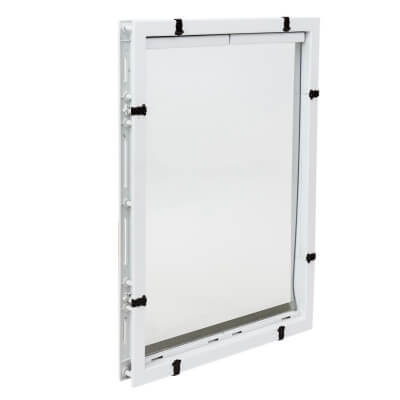 Врезная дверца из пластика для собак. Мягкая прозрачная створка, утяжеленная снизу металлической полоской, открывается и закрывается бесшумно, препятствует возникновению сквозняка в закрытом положении. Для надежного перекрытия дверцы при необходимости ограничить движение предусмотрена съемная металлическая задняя панель. Размеры дверцы подходят для собак крупных и средних пород.